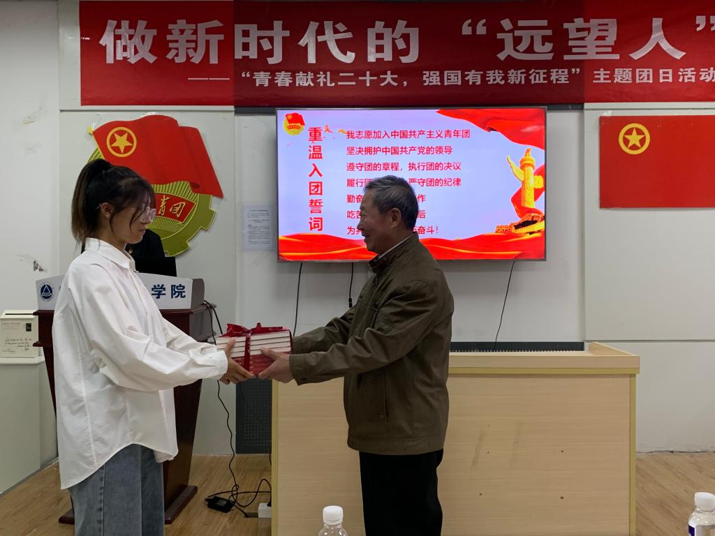 致敬与寄托。团支部书记李婉婷代表“远望号”特称团支部为刘仁生送上一盆绿植,向老一辈远望人致敬,祝刘老福泰安康。刘仁生向同学们赠书,寄托远望,激励新时代青年不忘初心、破浪前行。