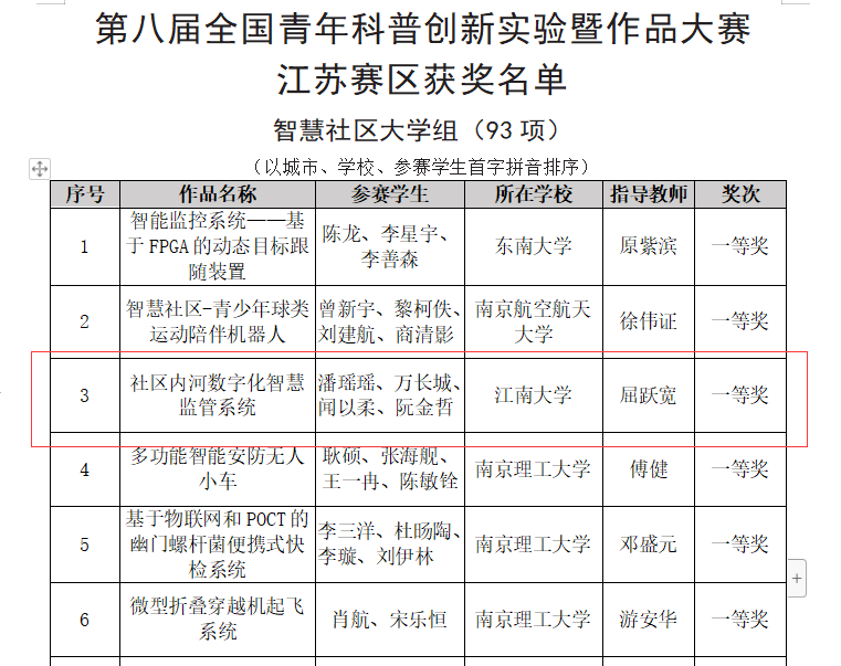 第八届全国青年科普创新实验暨作品大赛江苏赛区获奖名单