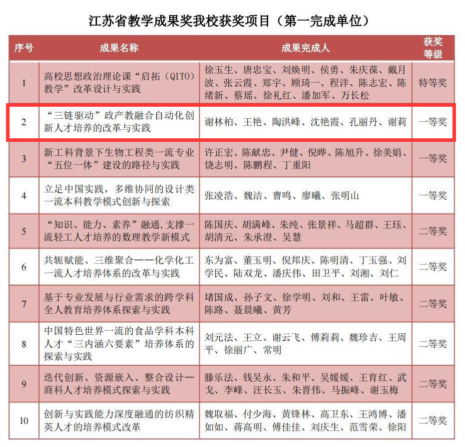 近日,江苏省教育厅正式发布了《关于公布2021年江苏省教学成果奖获奖项目的通知》(苏教人〔2022〕4号),江南大学作为第一完成单位喜获10项江苏省教学成果奖。其中,由我院谢林柏教授主持完成的《“三链驱动”政产教融合自动化创新人才培养的改革与实践》荣获高等教育类一等奖。