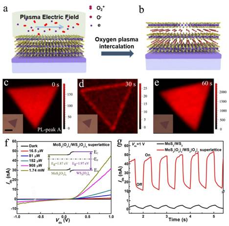 课题组利用平行等离子体电场将等离子体中的O2+离子插入到典型二维半导体如过渡金属硫族化合物(TMDs)中亚纳米尺寸的层空间,从而构造出由TMDs单层和氧分子层相互交叠的二维原子晶体分子超晶格结构。这种二维超晶格能大大地扩张TMDs相邻层之间的间距,进而抑制了TMDs相邻层之间的范德华耦合,因此赋予了这种二维原子晶体分子超晶格奇异的物理特性,如100倍强的荧光特性和100倍高的光电流。所以,这种温和等离子插层工艺不仅是一种可以调节二维半导体层间堆叠和相互作用的潜在通用方法,还为实现二维半导体超晶格的按需可控制备打下了坚实的基础,极大地提升了二维半导体超晶格在实际光电子器件的应用潜力。
