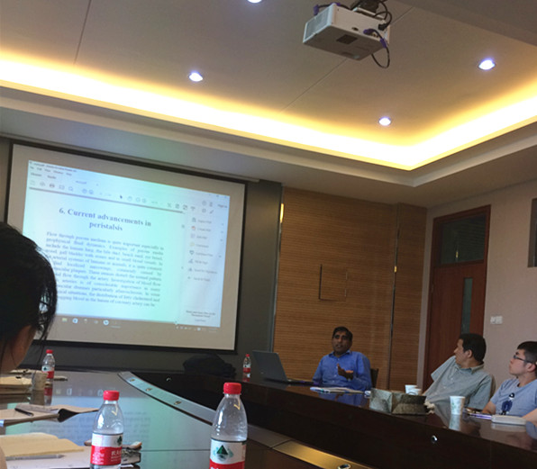会上,Hayat教授讲述了应用数学建模的背景知识,介绍了磁流体动力学下二阶流体在非对称信道里的蠕动现象的建模,对非牛顿流体的剪增稠和剪稀释效应以及在壁面蠕动的情况下磁场力、捕获和抽吸特性对流体的影响都进行了建模分析。报告后,Hayat教授与青年老师及研究生进行了讨论及交流,进一步开阔了大家的研究视野,对大家的科研、工作和学习产生了新的灵感和启发。