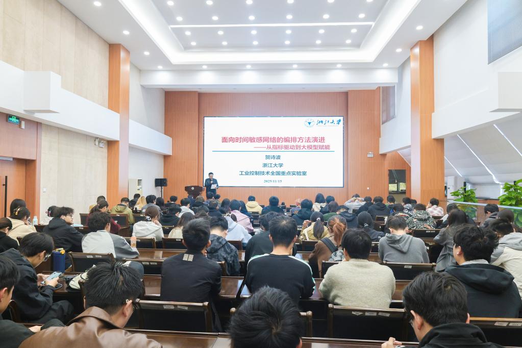 D328举行。浙江大学求是特聘教授贺诗波应邀作题为《面向时间敏感网络的编排方法演进:从指标驱动到大模型赋能》的专题报告,吸引了150位本硕学子聆听。活动由副院长王子赟主持。