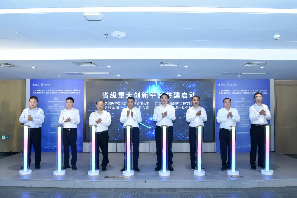 陈卫、顾正彪、黄敏、崔荣国、朱晓峰、李桂林,以及无锡高新区两家企业代表共同启动两个省级重大创新平台,标志着校地合作迈入新阶段。