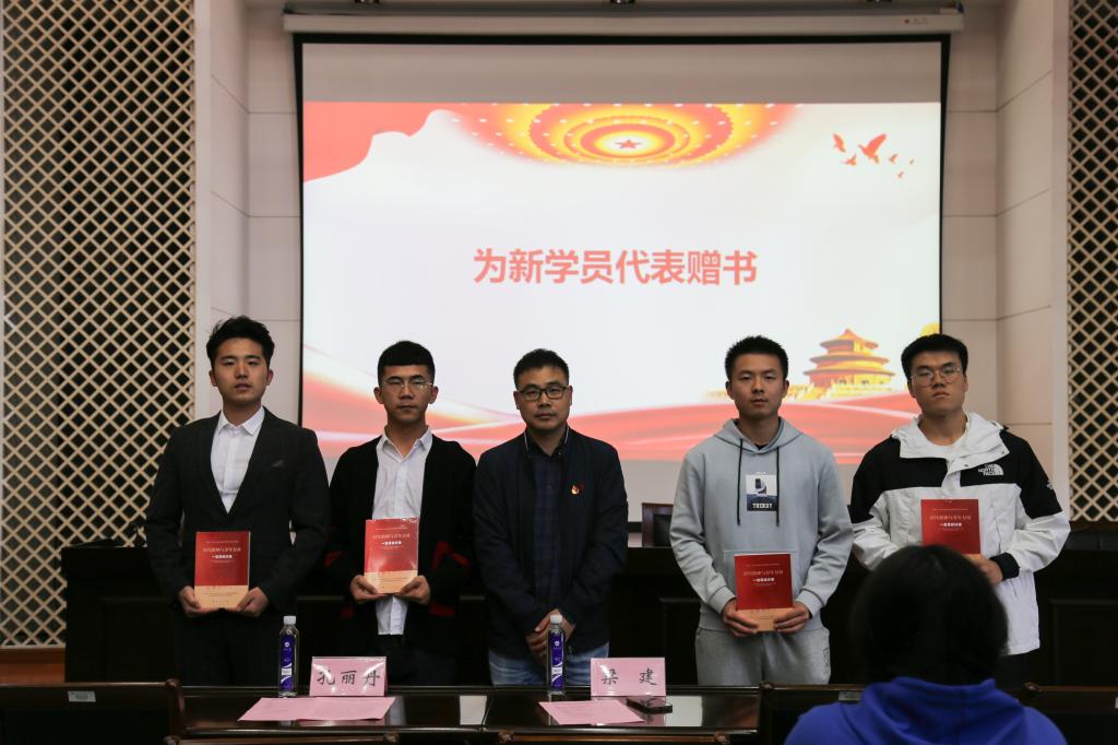 随后,第43期分党校优秀学员代表韩静发言。她分享了自己在党课培训中的心得体会,讲述了自己在身份意识和思想上的转变,激励学员作为党员发展对象,要始终坚定理想信念,筑牢精神支柱,以身作则自觉遵守疫情防控规定,发挥模范带头作用。接着,梁建为第44期发展对象培训班代表赠书,李灿介绍了此次分党校培训内容和考核方式。