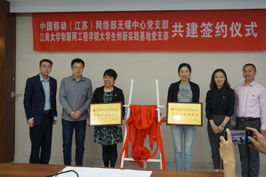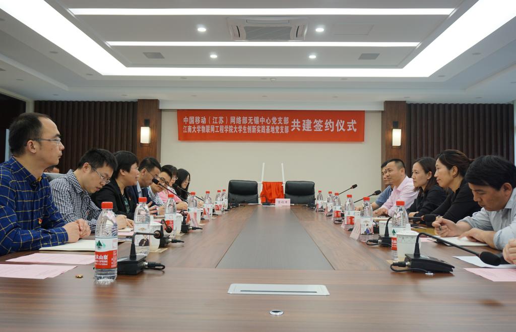 2019年5月16日下午,江南大学物联网大学生创新实践基地党支部与江苏省移动网络部无锡中心党支部共建签约仪式在巅峰国际