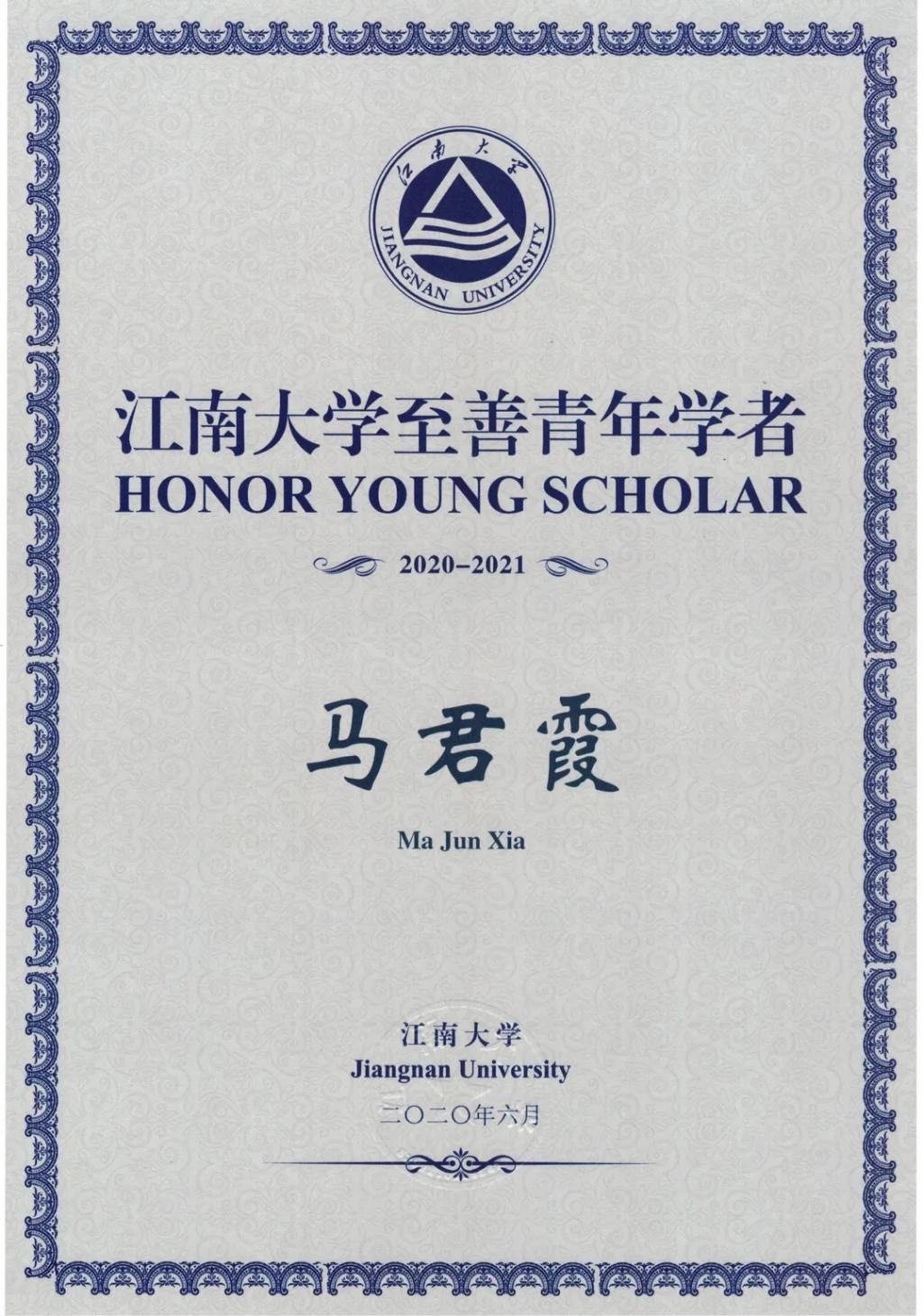 信息技术系马君霞老师获评江南大学2020-2021年度“至善青年学者”称号。