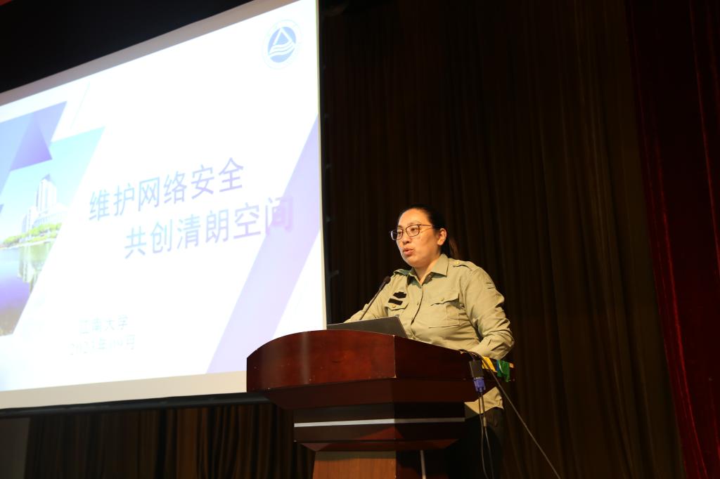 孔丽丹首先对2023级新同学表达了热烈的欢迎和祝贺,并作“维护网络安全,共创晴朗空间”主题讲座。她从网络安全相关法律法规入手,告诫学生互联网不是法外之地、互联网不是虚拟空间;以真实案例为警示,强调维护校园网络安全和网络文明的重要性;以江南大学师生网络文明公约、学生诚信档案管理办法为纲,倡导师生共同重视个人网络安全防护,共建平安美好校园。最后,她勉励在座本科新生,秉承“笃学尚行,止于至善”的校训精神和“不唯上,不唯书,只唯实”的院训精神,不负韶华,不枉青春,努力实现入学伊始、意气风发之时所设定的奋斗目标。