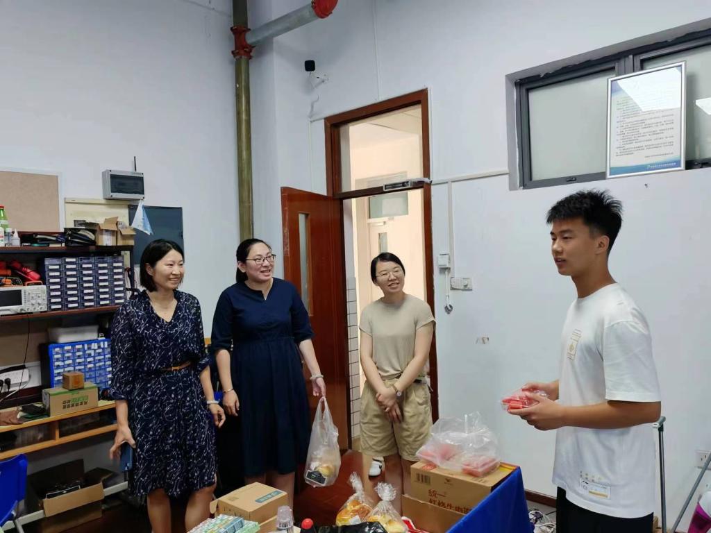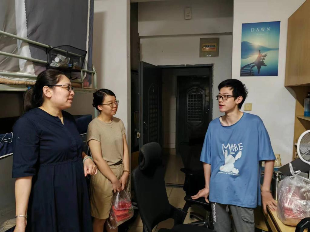 院长栾小丽、党委副书记孔丽丹、分团委书记洪筱及辅导员王涛、屈跃宽一行深入学生宿舍、实验室、科创俱乐部等地看望留校学生,送去消暑慰问物资,给留校学生带去学院的关心和问候。
