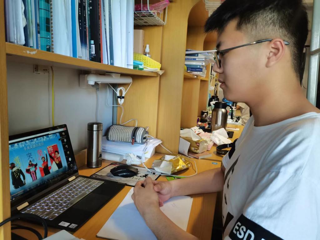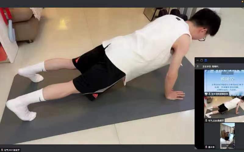 随后举行的线上同屏竞技大赛将活动推向高潮。两个支部围绕平板撑、俯卧撑项目,选拔推荐最有实力的选手参赛。在平板撑比赛中,来自两个团支部的团员代表刘宏滨和周栩莺展开了激烈的比拼,同学们在屏幕前为他们加油,最终以平局收官。在俯卧撑比赛中,参赛选手陈俊宇和沈家豪卯足了劲,数数声一浪高过一浪,最终陈俊宇同学取得胜利。团员们在收获欢乐与欢笑的同时,身临其境地感受到体育比赛的魅力!