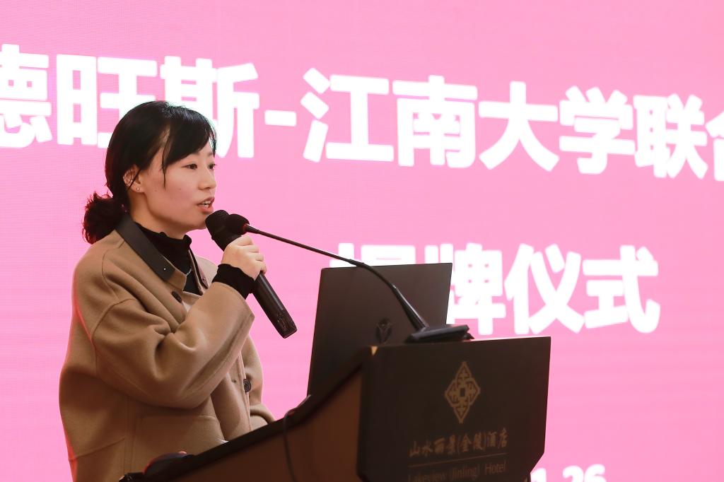 陈莹赟在致辞中表示,校企联合是学校发展的需要,也是企业发展的需要,通过合作,学校和企业可以优势互补,资源共享。她希望江南大学和爱德旺斯公司通过本次产学研合作的契机,构筑良好的校企合作平台,努力为社会培养更多技术型人才,促进校企携手,共同发展。