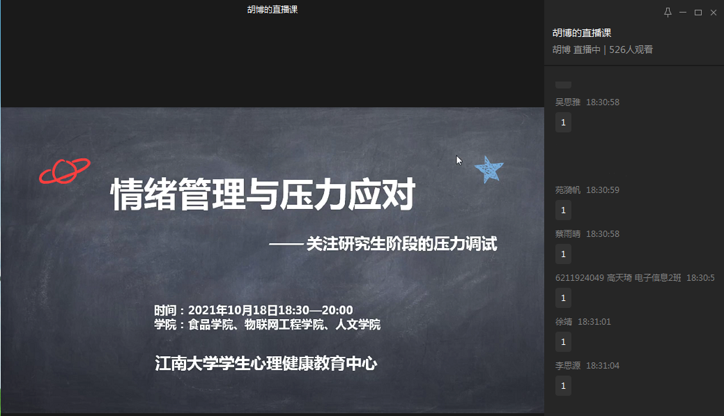 在讲座中,胡老师从什么是情绪开始,以生活案例为切入点,直观生动地描述了情绪、情绪的功能与评价、健康情绪的标准等。接着,她从情绪关注策略、认知关注策略和反应关注策略三个维度给同学们传授了管理和调节情绪的建议、方法。最后,针对研究生科研、学业、人际交往等方面的压力,她重点从如何看待压力、如何缓解压力的角度与学生交流、讨论,同时向学生介绍了学校心理健康教育中心,以及寻求心理咨询的途径。整场讲座生动有趣、知识层层递进,学生们参与度高,与胡老师积极互动,分享自己的感受与困惑。