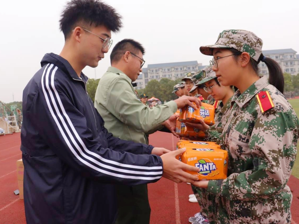 党委书记程捷音,院党委副书记、副院长孔丽丹,校人武部军事训练科科长韦红武,院分团委书记吴垚,带训辅导员和学生会主要学生干部一起来到西北操场,看望正在军训的教官和新生,并送上慰问品。