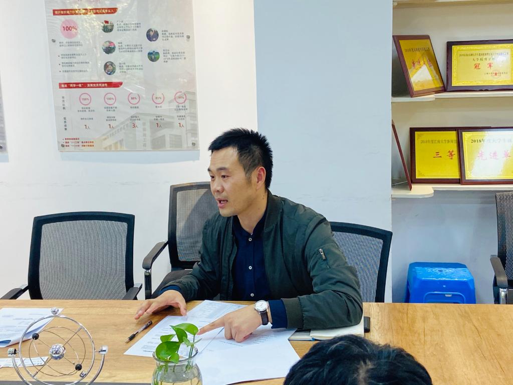 洽谈创新创业比赛事宜。物联网学院党委副书记、副院长孔丽丹,分团委书记、大学生创新实践基地党支部副书记吴垚,支部学生党员代表参与会谈。