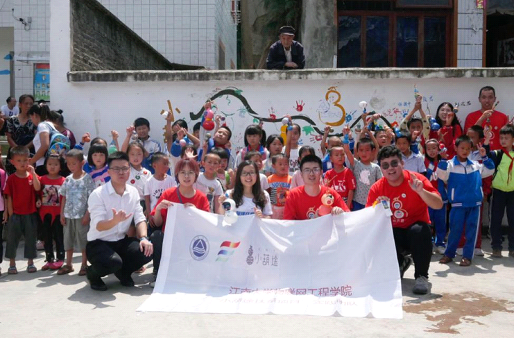 本次社会实践活动,得到了学院的高度重视。通过前期周密策划,学院联系了我校2007届计算机专业校友,智伴科技创始人王不凡,并获得了其创办的广州智伴科技有限公司对本次社会实践活动的大力支持。结合校友资源和创业项目,学院和校友企业共同走进贵州黔西县土桥村希望小学,开展了“为世界添彩”智伴公益行活动,为当地小学捐赠了150余台AI智能机器人用于教师教学和学生日常学习,同时捐赠了教学物资等总价值达17余万元。活动当天江南大学党委副书记耿向阳,小葫途创业团队黄致君,智伴科技、黔西县教育局、金碧镇有关负责人出席了捐赠活动。