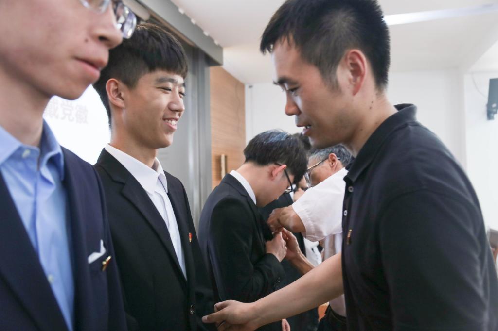 大会伊始,全体老师和学生起立,面向党旗,奏唱《国际歌》。随后,由耿向阳书记宣读参加入党宣誓的预备党员名单。接下来,大会进入第三项议程,参与大会的新党员集体佩戴党员徽章。由燕庆明、程捷音、耿向阳、童建森、朱凯元、赵曾贻、刘营生、吴垚等八位老师为新党员代表佩戴党员徽章,其他同学自行佩戴党员徽章。之后全体党员起立,在吴垚老师的带领下,面对鲜红的党旗,庄严宣誓。大会现场声音洪亮,气势磅礴,党员同志们用自己的力气呐喊出自己志愿入党、为党奋斗的心声。