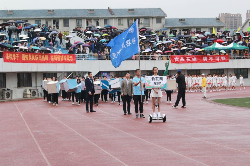 运动会以各学院和教职工组织表演方阵开场,各学院的方阵新颖、创意十足,体现了江南人的阳光健康形象。值得一提的是,体育部精心筹划了由物联网学院设计学院等学院组成的千余人团体操方阵,以迎接江南大学60周年校庆,方阵包括了舞旗、舞刀、气功三个节目,彰显了江南学子蓬勃向上的精神风貌。此次物联网学院方阵也极具特色,由礼仪脚踏智能平衡车率领方阵,组成方阵的48位同学用精心准备的盒子自由变换形式,展示了江南大学校徽和校庆60年等队形,体现了“心心相连,爱我物联”的学院口号和勇于创新的学院精神,彰显了我院的独特风采,赢得了学校师生们的一致好评。表演期间的大雨并不能浇灭同学们的热情,校领导更是专注地看完了整场表演,不曾留意雨水浸湿了衣衫。最后陈坚校长用铿锵有力地声音宣布此次运动会正式开幕。