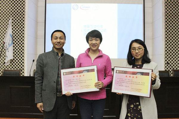 尹冬欣同学作为优秀营员代表发言。他在结合自身发展情况的同时,特别指出了讲座中“职业生涯规划”对自身的影响颇大,对学院的精心栽培以及公司大力支持表示感谢;王晓东女士宣布了“英飞凌”科技奖学金获奖名单并为获奖者颁奖。耿向阳副书记也向英飞凌科技(无锡)有限公司颁发捐赠证书,以此代表江南大学与英飞凌科技(无锡)有限公司长期以来的友好合作。