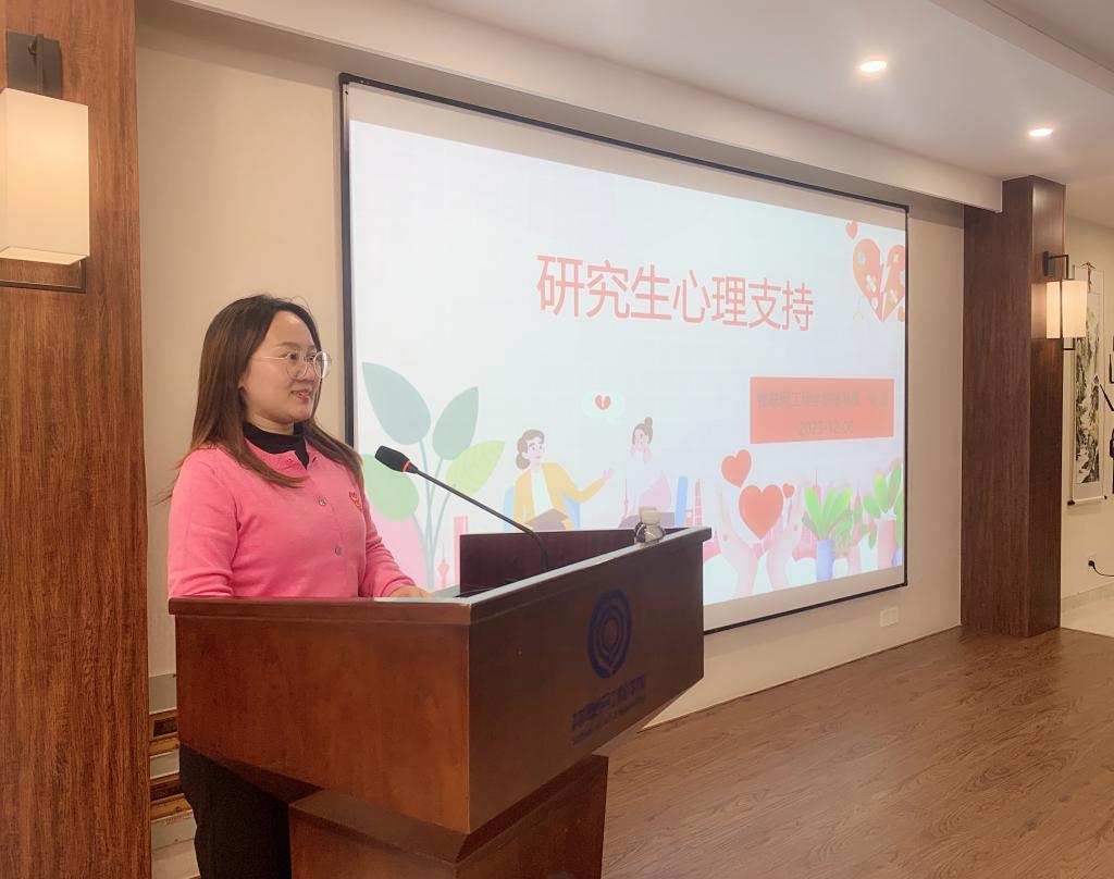 张圆作研究生心理支持专题培训。她依据心理学相关知识概念,结合心理疏导经验、学生工作心得,从了解情绪概念、识别心理问题、促进师生交流、积极心理支持等四个方面展开。她带领现场导师从大脑结构了解情绪产生机制,从情绪来源分类体会情绪觉察、认知重评的情绪管理策略,从“师源性伤害”明确构建融洽信任师生关系的重要性,从区分情绪问题和心理问题梳理当代研究生心理问题分布以及如何从日常相处出发提供积极心理支持,并且对研究生导师自我心理调适保健给予关怀和建议。最后,张圆现场发布了由江南大学圆心辅导员工作室“爱心”实践团组织开展的研究生心理赋能计划以及预约方式,希望通过“上门宣讲+互动体验”的直观形式,进一步助力以课题组为交际单位的理工科研究生的积极心理素质培育。