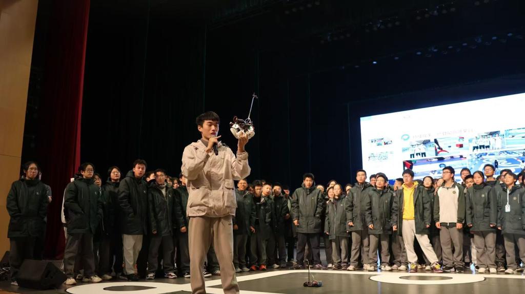随后,物联网大学生创新实践基地智能车俱乐部、机器人俱乐部和飞行器俱乐部的学生代表为同学们展示了自主研发的独轮车、电磁接力赛车、四足机器人以及自旋翼飞行器的外观设计、工作原理等。同学们动手操作驾驶模拟器,体验自动行驶、避障、协同的智能场景,与“机器狗”完成“问好”“跳舞”等人机互动,探索了“飞行器+视觉信息+智能处理”的奥秘,沉浸在奇妙的科学世界中,时而惊叹,时而欢笑,充分感受到了科学的魅力和乐趣。