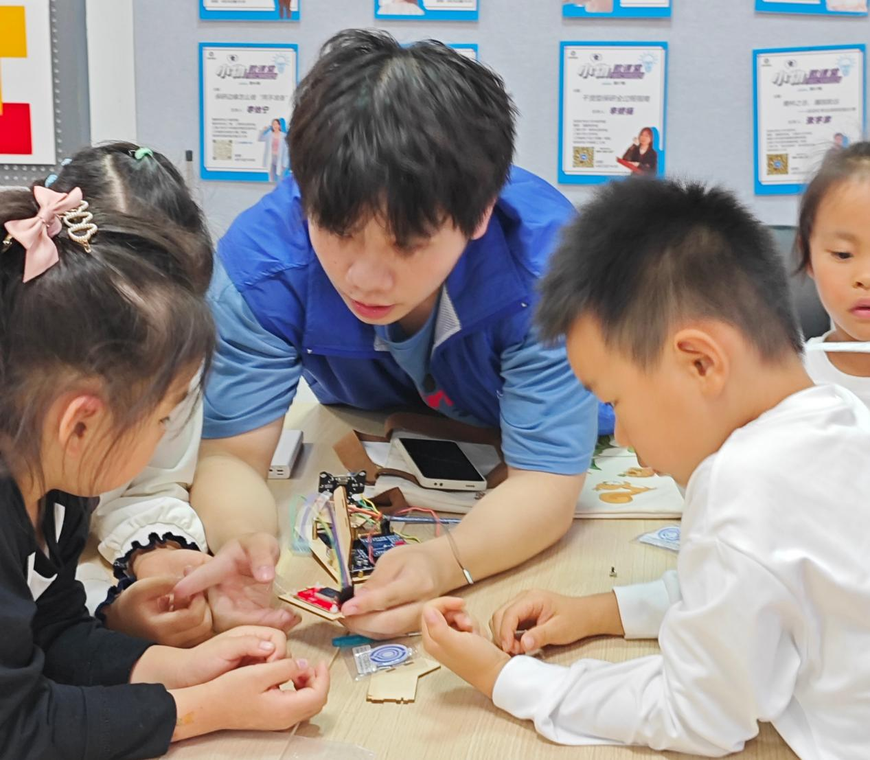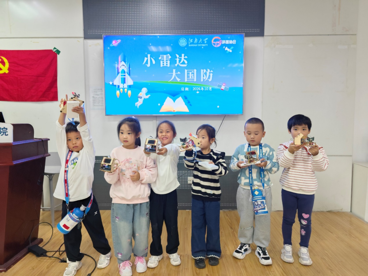 大学生创新实践基地,了解了现代科技在国防、工业、生活等多个领域的应用。大学生创新实践基地党支部的党员们担任主讲与助教,为孩子们带来了一堂生动有趣的“小雷达 大国防”公益课程。课程从蝙蝠的回声定位讲起,逐步引导孩子们理解了雷达的工作原理,并通过动画片和趣味游戏的方式,让孩子们在轻松愉悦的氛围中掌握了雷达的构造和探测方法。