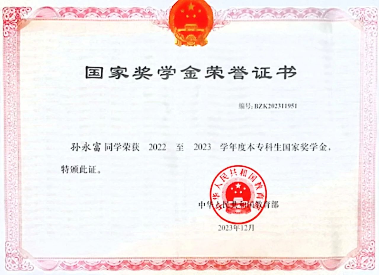 国家奖学金荣誉证书