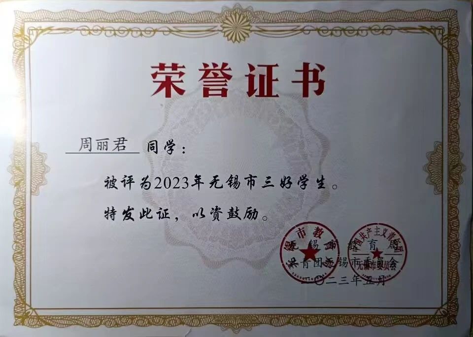 周丽君,女,汉族,2002年11月生,预备党员,自动化专业2021级本科生;曾任班级心理委员;曾获国家励志奖学金、蓝桥杯单片机设计与开发二等奖、西门子智能制造挑战赛二等奖等奖项,获无锡市三好学生、江南大学三好学生等荣誉。现已保研至江南大学。