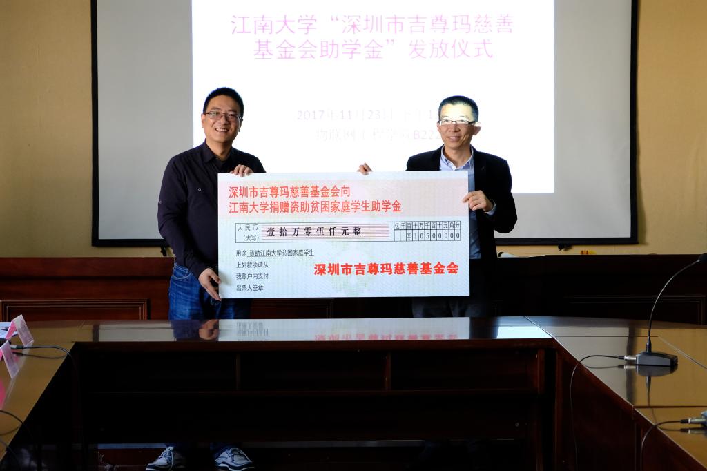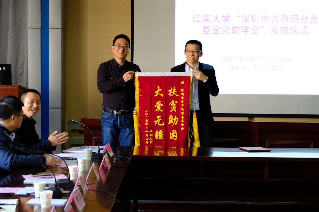 最后吉尊玛慈善基金会副理事长张博向江南大学捐赠助学金,社会资源处黄敏处长向深圳市吉尊玛慈善基金会赠送锦旗,仪式在嘉宾与同学们的合影中圆满结束。同学们脸上洋溢着喜悦与感激的笑容。